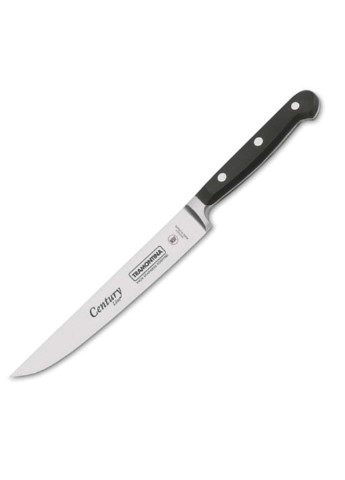 Нож CENTURY Материал лезвия: нержавеющая сталь Материал рукоятки: поликарбонат Режущая кромка ножа: гладкая Цвет: черный Назначение ножа: универсальный Универсальный нож Tramontina Century 24007/107 на практике используется чаще всегоДаже при отсутствии специальных инструментов для каких-либо работ повара и хозяйки отлично с ними справляютсяНарезать овощи или мясо, сыры или колбасы, аккуратно отрезать хлеб всё это удобно делать специальными ножамиНо если их нет, на помощь приходит нож универсальныйНожи серии CENTURY относятся к профессиональным высококачественным ножам, благодаря особому подбору материалов и технологии изготовленияCENTURY является высококлассной высокопроизводительной линией кухонных ножей созданной специально для шеф-поваров и гурмановГлавной особенностью этих ножей является очень острая заточка, что позволяет нарезать продукты чрезвычайно тонкими ломтиками даже для самых сложных и виртуозных рецептовЭто достигается благодаря кованому клинку: ковка уплотняет кристаллическую решетку металла и делает режущую кромку ножа более долговечнойИдеально эргономичная ручка из поликарбоната и стекловолокна является продолжением клинка и обеспечивает комфорт и безопасность при резкеОсобенности: Материал лезвия: Кованная сталь европейского стандарта DIN 1.4110 Толщина лезвия: 2,5 мм Закалку до твердости 56 единиц по шкале Роквелла с криообработкой Матуриал рукоятки: поликарбонат Можно мыть в посудомоечной машине Бренд Tramontina основан в Бразилии в 1911 году10 фабрик, которые производят более 18 000 наименованийОдин из лидеров мирового рынка по производству ножей, столовых и кухонных принадлежностей, посуды для приготовления пищи, инструментов для сельского хозяйства, строительства и садаTramontina производит кухонную утварь только из наилучшей 18/10 нержавеющей стали, отполированной до зеркального блеска, которая со временем не тускнеет и не темнеетКаждый элемент разрабатывается с условием, чтобы он смог удовлетворить вкус, как обычного домовладельца, так и наиболее требовательного профессионального повараПриносит удовольствие от процесса приготовления пищи и от того, как это объединяет людей вовлеченных в этот процесс