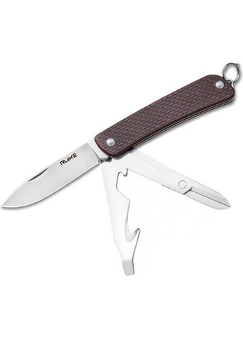 Описание ножа Ruike Criterion Collection L42: Выбирая для себя складной нож с дополнительными функциями, обязательно обратите внимание на модель Ruike L42. Это компактный инструмент, который нацелен на решение большого комплекса задач. Благодаря хорошо подобранным качественным материалам он прослужит очень долго, исправно выполняя свои функции. Самым главным из всех инструментов является нож. Он получил длину 85 мм, в то время как толщина клинка составляет 3 мм. Нож гладко заточен по всей длине кромки реза, а поверхность клинка гладко отполирована. На лезвии есть насечка, которая поддевается ногтем, чтобы нож легко открыть. Материалом для ножа и всех других инструментов этой карманной модели является сталь-нержавеющая сталь 12С27. Она поставляется из Швеции и хорошо известна своей сбалансированностью. Этот металл отлично противостоит коррозии, что очень важно для туристического ножа. Кроме того, он имеет твердость 58-59 HRC, которую приобрел в процессе криозакалки, а потому легко затачивается, но долго не тупится. Положение лезвия помогает регулировать встроенный ножом замок Slip-joint. Не давая жесткой фиксации, он все же препятствует случайной сборке ножа, что делает работу с ним существенно более безопасной. Не менее важную функцию, чем нож, играют другие инструменты, встроенные в Ruike L42. В нижней части рукоятки размещены пила по дереву, уменьшенные в размере ножницы, шило, две прямые отвертки (малая и средняя), стропорез, открывалку для бутылок, инструмент, зачищающий провода от изоляции. На обратной стороне рукоятки можно достать штопор. Еще два инструмента помещены со стороны торца – это стеклобой и небольшое кольцо для подвешивания к ножу темляка. Ручка в модели Ruike L42 также как и инструменты сделана из качественного и долговечного материала. Но в данном случае производители выбрали не металл, а стеклопластик с композитной структурой. Он значительно легче стали, также защищен от коррозии, не выгорает на солнце. Ножи Ruike L42 предлагаются с ручками трех разных цветов: зеленого, коричневого и черного. Каждая рукоятка украшается текстурной накаткой, которая играет и функциональную роль, предотвращая проскальзывание ножа в руке. Вес карманного ножа Ruike L42 равен 194,5 грамма. Особенности:. Гарантия:. Сложные ножи Ruike L42 получают официальную гарантию на 5 лет от производителей. Инструменты: Инструменты:. Информация: С. Треугольник обозначает год, а цифры месяц, когда этот нож был сделан