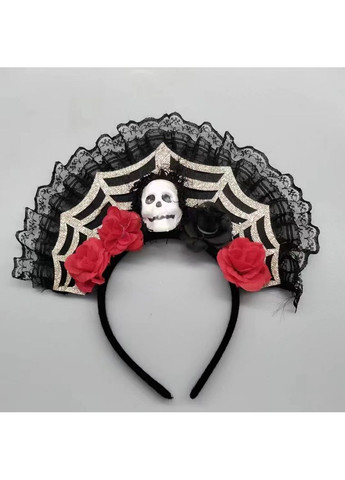 Обруч, декорированный серебристым черепом, чёрной короной shine, короткой фатой и стразами. Оригинальный аксессуар, разработанный и созданный нашими дизайнерами вручную, поможет создать неповторимый карнавальный образ на тематическую вечеринку Санта Муэрте (Santa Muerte) , Хэллоуин (Halloween). Размер черепа - 14,5х8 см. Диаметр розы - 17 см. Длина фаты - 80 см.