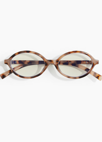 Создайте стильный офисный образ с пользой с очками-блюблокерами от H&M. Специальное напыление на линзах уменьшает проникновение вредного света от монитора компьютера или мобильного телефона на 30%. Линзы без диоптрий - подойдут каждому.  Форма: Oval. Материал оправы: пластик. Цвет оправы: бежевый/коричневый. Тип линз: прозрачные, с блокировкой синего света. Ширина линзы - 5,2 см. Ширина переносицы - 1,5 см. Длина дужки - 14 см. Дужки очков с логотипом бренда. Очищать только сухой или влажной тканью без ворса и добавления любых моющих или антисептических средств.  Отличное качество.
