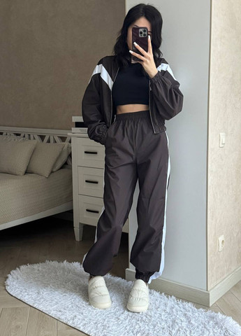 Стильный костюм из плащевки. Кофта на молнии. Брюки на резинке. Длина кофты на размер 42-44: 50 см, длина рукава: 63 см, обхват груди: до 105 см, обхват талии: до 88 см. Брюки: длина изделия-100 см, обхват талии: 59-65 см, обхват бедер: 90-110 см. Длина кофты на размер 46-48: 50 см, длина рукава: 63 см, обхват груди: до 110 см, обхват талии: до 98 см. Брюки: длина изделия-100 см, обхват талии: 68-74 см, обхват бедер: 105-110 см.