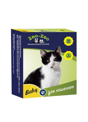 Лакомства с Омега 3 специально созданы для того, чтобы побаловать своего любимца и показать привязанность хозяина, а также для поддержания здоровья питомца. Витаминизированные лакомства для котят ZOO-ZOO изготовлены на основе растительных компонентов и животных (рыба). Состав: Пробиотики Омега 3 кислоты Экстракт пищевых дрожжей Витаминно-минеральный комплекс В 1 таблетке Витаминизированных лакомств ZOO-ZOO содержится: протеина не менее 12%, жира не менее 1%, кальция не менее 0,4%, фосфора не менее 0,5%, Омега-3 не менее 3 мг, биотина 5 мкг Состав: Пробиотики Омега 3 кислоты Экстракт пищевых дрожжей Витаминно-минеральный комплекс В 1 таблетке Витаминизированных лакомств ZOO-ZOO содержится: протеина не менее 12%, жира не менее 1%, кальция не менее 0,4%, фосфора не менее 0,5%, Омега-3 не менее 3 мг, биотина 5 мкг