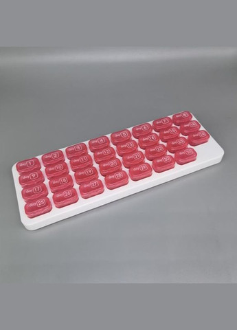Таблетница на 31дней Таблетница на 31 дней — удобный органайзер для хранения и дозирования лекарств. Разделена на отдельные отсеки по дням недели, что помогает не забывать о приеме таблеток. Компактный размер позволяет легко носить с собой, а прочный материал обеспечивает надежность и долговечность. Идеальный помощник для тех, кто заботится о своем здоровье. Характеристики: Тип: таблетница Материал: пластик Материал крышки: пластик Количество отделений: 31 Форма: прямоугольная Яркий дизайн Размеры: 10.4х28.5 см