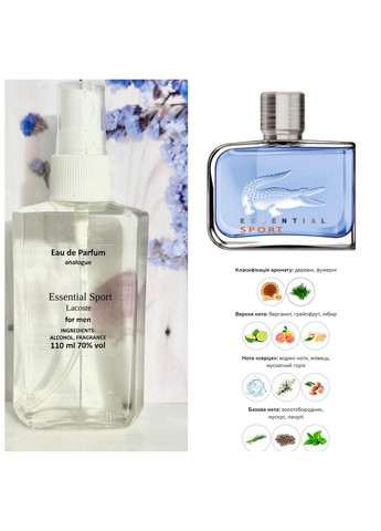 Парфюмы украинского производства с использованием французских компонентов с содержанием 30% аромаконцентрата. Стойкость до 24 часов на теле, на одежде дольше Essential Sport свежая и одновременно яркая парфюмированная вода. Верхние ноты ароматической пирамиды звучат бергамотом, грейпфрутом и пикантным аккордом имбиря. В «сердце» Essential Sport переплелись водные аккорды, можжевельник, герань и мускатный орех. Финальные штрихи композиции представлены комбинацией пачули, ветивера и мускуса. Пол: мужские Классификация аромата: древесные, фужерные Верхняя нота: бергамот, грейпфрут, имбирь Нота "сердца": водяные ноты, можжевельник, мускатный орех Базовая нота: ветивер, мускус, пачули