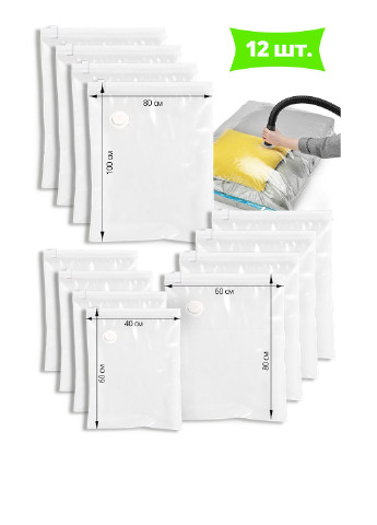 Вакуумные пакеты для хранения одежды. Комплект из 12 пакетов - ТМ ComShop Комплект из 12 пакетов для хранения одежды - ТМ Comshop. Размеры пакетов - 40х60 см (4 пакета), 60х80 см (4 пакета), 80х100 см (4 пакета). Сжимать одежду с помощью вакуумных пакетов легко и быстро. Для этого выполняем три шага: 1. Сложить всю необходимую одежду в пакет, закрыть молнию; 2. В специальный клапан вставить шланг от пылесоса; 3. Втянуть воздух пылесосом, закрыть клапан. Напоминаем, что чем объемнее одежда (пуховики, подушки и т. д.), тем меньше они станут. Плотные материалы с небольшим количеством воздуха стягиваются меньше (шуба, дубленка). Сразу рассчитывайте необходимый размер. Повторять процедуру можно несколько раз, все пакеты для одежды многоразовые. Назначение - для одеял, для одежды, для подушек. Цвет - прозрачный. Страна-производитель товара - Китай. Страна регистрации бренда Украина - ТМ Comshop.