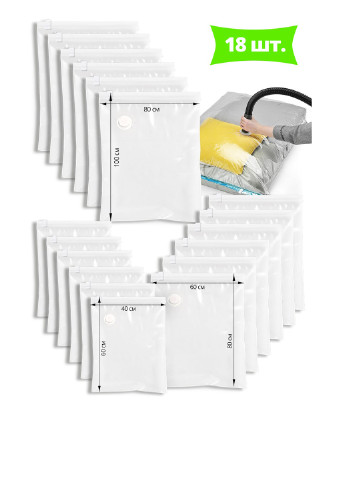 Вакуумные пакеты для хранения одежды. Комплект из 18 пакетов - ТМ ComShop Комплект из 12 пакетов для хранения одежды - ТМ Comshop. Размеры пакетов - 40х60 см (6 пакета), 60х80 см (6 пакета), 80х100 см (6 пакета). Сжимать одежду с помощью вакуумных пакетов легко и быстро. Для этого выполняем три шага: 1. Сложить всю необходимую одежду в пакет, закрыть молнию; 2. В специальный клапан вставить шланг от пылесоса; 3. Втянуть воздух пылесосом, закрыть клапан. Напоминаем, что чем объемнее одежда (пуховики, подушки и т. д.), тем меньше они станут. Плотные материалы с небольшим количеством воздуха стягиваются меньше (шуба, дубленка). Сразу рассчитывайте необходимый размер. Повторять процедуру можно несколько раз, все пакеты для одежды многоразовые. Назначение - для одеял, для одежды, для подушек. Цвет - прозрачный. Страна-производитель товара - Китай. Страна регистрации бренда Украина - ТМ Comshop.