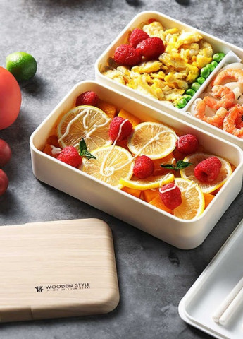 Наслаждайтесь вкусной и полезной домашней едой, берите её с собой на работу, учёбу, в поездки... Ланч бокс 1200 мл Wooden поможет вам идеально организовать ваш перекус. Контейнер для еды имеете два больших слоя, не предназначен для жидких блюд, но подойдёт для гарниров, вторых блюд, салатов..., в комплекте ложка и палочки. Два слоя ланч бокса объединяются с помощью резинки Bento, можно брать с собой один или 2 этажа. Можно греть в микроволновке и мыть в посудомоечной машине без крышки. Характеристики ланч-бокса: Материал: пищевой пластик Размер: 18.5х10х 0.5 cм Обьем: 1200 мл