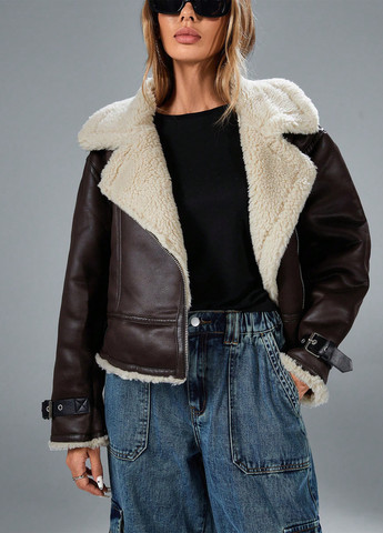 Женская куртка из искусственной овечьей шерсти. Это байкерское пальто предназначено для осени/зимы 2024 года. Имеет свободный крой и вырез с лацканами. Куртка включает карманы и застежку-молнию. Ткань не тянется, рукав и подол стандартные.