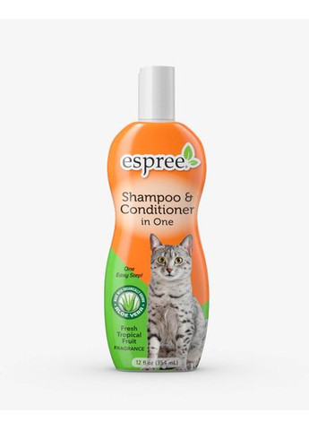 Shampoo and Conditioner in One for Cats Шампунь и кондиционер в одном флаконе Универсальная формула 2 в 1 Содержит органическое алоэ вера Без тестов на животных Нежная для котят и щенков формула Изготовлен из ингредиентов высокого качества Шампунь и кондиционер в одном флаконе рекомендованы для всех видов шерсти. Чистит, восстанавливает и придает блеск шерсти за один раз! Органическое алоэ вера и пантенол оставляют шерсть мягкой сияющей и чистой! Применение: Используйте разбавленным (16 частей теплой воды на 1 часть шампуня), хорошо перемешайте. Проветривайте в шерсть собаки или кота, избегая участков вокруг глаз и внутренней части ушей. Повторите при необходимости. Вытрите полотенцем. Состав: очищенная вода, моющее основание из кокосового ореха, перламутр, увлажнитель, кондиционер, сок алоэ вера, консервант, ароматизатор, EDTA, провитамин В5, краситель: FD&C Yellow 5, витамин Е, D&C Red 33, витамины А и Д. Аромат: тропические фрукты. Вся продукция Эспри содержит сок органического Алоэ Вера. Полезные и питательные вещества Алоэ Вера обеспечивают максимальное увлажнение кожи. Алоэ вера проникает в кожу в 4 раза быстрее, чем вода, лечит аллергические сыпи, солнечные ожоги, укусы насекомых, мелкие царапины, уменьшает отеки, усиливает иммунный ответ.