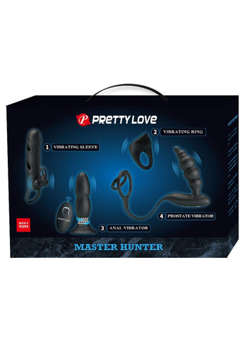 Побалуйте себя роскошным удовольствием с коллекцией Master Hunter из 4 предметов. Сексуальная игра уже готова и ожидает, чтобы высвободить мощную стимуляцию! Оживленная четверка секс-игрушек идеально подходит для сольных сессий и парных игр. В набор входят: - анальная пробка на присоске с вибрацией и круговыми вращениями (длина 13,5 см, диаметр 3,7 см), заряжается через USB-шнур. Вибрация переключается кнопкой на пробке и беспроводным пультом (работает от 1 батарейки типа ААА) - насадка на пенис с кольцом на мошонку и отростком-кроликом для стимуляции клитора (общ. длина без кольца - 14см, диаметр 3,3 см). Можно использовать с вибропулей. - Эрекционное кольцо на пенис со стимуляцией клитора (диаметр растягивается). Можно использовать с вибропулей. - кольца на пенис и мошонку с вибростимулятором простаты в форме зьенаных шариков (глубина проникновения 8 см, макс. диаметр диаметр 2,5 см) - вибропуля (работает от 3 батареек LR41) Все аксессуары эластичные, хорошо тянутся и изготовлены из силикона.