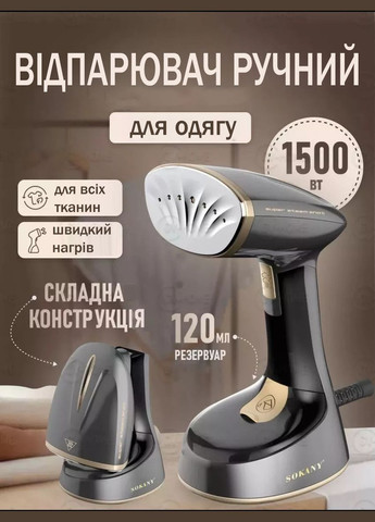 Отпариватель ручной для одежды SOKANY SK-GT-3065 1300 Вт складная кострукция Отпариватель SOKANY SK-GT-3065 – удобно брать с собой в поездки, он незаменим для оперативного благоустройства одежды. Парогенератор вертикальный – серьезный конкурент паровых утюгов: он позволяет быстро погладить любые вещи и текстильные изделия. Вертикальный отпариватель – более функциональное и универсальное устройство, чем утюг. Кроме отпаривания и утюжка можно отпарить шторы и портьеры (для этого их необязательно снимать), почистить обивку мягкой мебели, матрасы, кровати. Также он отлично дезинфицирует вещи, поскольку горячий пар убивает пылевые клещи и микроорганизмы. Для достижения лучшего эффекта во время очистки можно надеть на утюг ворсовую щетку. Отпариватель обеспечивает деликатный уход за тканями, не испортит ни пуховик, ни шелковую блузу, им легко отпаривать текстиль с большим количеством мелких деталей (стразов, пуговиц). Также он эффективен для плотных тканей, верхней одежды, головных уборов, не подлежащих глажке обычным утюгом. Характеристики: Мощность: 1300 Вт Быстрый нагрев Не оставляет следов Подача пара: 20 г в минуту Емкость резервуара для воды: 120 мл