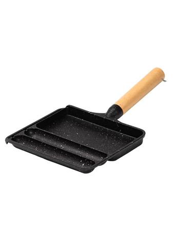 Сковорода прямоугольная на 3 секции – практичный инструмент для приготовления разнообразных блюд. Изготовлена из алюминия с антипригарным покрытием, она разделена на три секции, что позволяет одновременно готовить несколько различных ингредиентов без смешивания вкусов. Удобная ненагреваемая ручка защищает ваши руки от ожогов. Антипригарное покрытие предотвращает пригорание, позволяя готовить без использования растительного масла. Благодаря толстому дну сковорода обеспечивает идеальное рассеяние тепла, что способствует равномерному приготовлению блюд с насыщенным ароматом. Эта сковорода станет незаменимым помощником на вашей кухне, обеспечивая удобство и эффективность приготовления пищи. Рекомендации по использованию сковороды: Рекомендуется готовить на малом или среднем огне. Чтобы защитить поверхность от царапин, используйте силиконовые или деревянные столовые приборы. Категорически не рекомендуется использовать металлические ложки и кухонные лопатки. Чтобы избежать повреждения, следует мыть сковороду только после полного охлаждения, не использовать жесткие мочалки, щетки, абразивные пасты и чистящие порошки, агрессивные вещества. Основные характеристики сковороды: размер сковороды 21×18.5×2 см; высота стенок сковороды 2 см; объем большей секции 250 мл; объем меньших секций по 100 мл; толщина стен 4 мм; материал ручки – бакелит; антипригарное покрытие. Преимущества сковороды: сковорода подходит для газовых и электрических плит; безопасное антипригарное покрытие без вредных соединений; гранитное покрытие для предотвращения прилипания пищи и равномерного распределения тепла; эргономичная ручка, которая не нагревается в процессе приготовления; прямоугольная форма для экономии места на варочной поверхности.