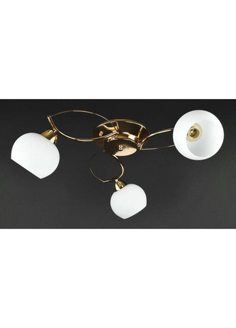 Потолочная люстра, корпус металлический. Плафоны стеклянные белого цвета размером 10х13 см. Патрон Е27. Крепление к потолку на планку, основа диаметром 18 см.Потолочные люстры - это практичность, легкость и простота. Выбирайте потолочную люстру по размеру и количеству плафонов, такую, которая лучше всего подойдет к размеру и стилю именно вашего помещения. Потолочную люстру купить можно и в гостиную, и в спальню, и в кабинет, на кухню или прихожую.Высота люстры, см: 18Ширина люстры, см: 55Диаметр/длина, см: 55Материал плафона: СтеклоМатериал корпуса: МеталлЦвет плафона: БелыйЦвет корпуса: ЗолотоКоличество источников света: 3Мощность, Вт (макс): 60Тип патрона: E27Пульт д/у: НетНочная подсветка: НетПроизводитель: Китай