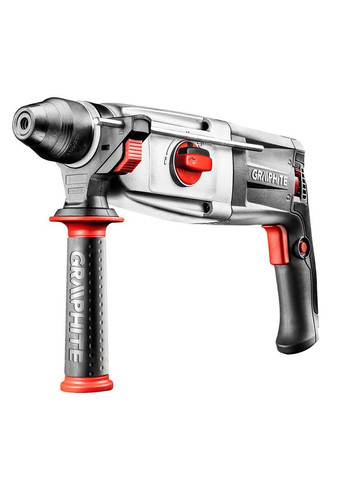 Четырехфункциональная перфораторная дрель SDS-plus GRAPHITE (арт. 58G527) мощностью 720 Вт имеет функцию сверления с ударом, сверление без удара, функцию подбивки и возможность текущей регулировки угла установки зубила для прецизионной подбивки. Максимальный диаметр просверливаемого отверстия в бетоне составляет 26 мм, в дереве 30 мм, а у стали 13 мм. Перфораторная дрель имеет переключатель реверса шпинделя без потери мощности на реверсе и блокировки кнопки включения в режиме непрерывной работы. При сверлении оборудование может достигать до 1250 оборотов в минуту. Конструкция позволяет использовать пневматический удар с частотой 5550 ударов в минуту и мощностью 2,8 Дж. В комплекте поставляется дополнительное сверло, дрельный патрон, адаптер для патрона и удобный чемоданчик для перевозок. Оборудование оборудовано эластичным и крепким сетевым шнуром в резиновой оболочке, длиной 3 м, предназначено также к профессиональному и промышленному применению как внутри, так и наружу помещений. Соответствие европейским стандартам обеспечивается сертификатом CE. Товар недоступен для продажи в Германии.