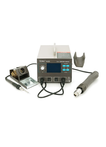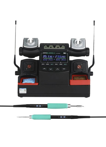 Aifen A902 Pro: профессиональная паяльная станция для ремонта электроники Aifen A902 Pro — современная паяльная станция для точной работы с печатными платами и ремонта электроники. Она сочетает высокую мощность, двойное управление и удобный интерфейс с большим дисплеем, обеспечивая стабильность и комфорт при пайке. Почему стоит купить паяльную станцию Aifen A902 Pro? Эта модель выгодно отличается от стандартных решений продвинутыми функциями: независимая работа двух паяльников, быстрый и точный микропроцессорный контроль температуры, автоматический переход в режим ожидания и расширенная совместимость с ручками C115, C210, C245 и C470*. Всё это делает Aifen A902 Pro оптимальным выбором для сервисных центров и специалистов по электронике. *Примечание. Данная модель комплектуюется ручками C210 и C245. Преимущества паяльной станции Aifen A902 Pro Два полноценных канала Две ручки можно использовать одновременно или по отдельности. Каждая зона (A и B) управляется независимо: включение и выключение выполняется прямо с панели управления без лишних манипуляций. Быстрый и точный микропроцессорный контроль Станция использует программное управление вместо традиционного регулирования по сетевому напряжению. Это обеспечивает быстрый нагрев и точное поддержание температуры даже при продолжительной пайке. Ручки C210 и C245 в комплекте В комплект входят две ручки — для жала C210 и C245, что позволяет использовать станцию для разных видов пайки: от тонкой работы с мелкими компонентами до монтажа более массивных элементов. Удобный и информативный дисплей Большой экран показывает все ключевые параметры: заданную и текущую температуру, процент мощности и индикатор прогрева. Для каждого канала предусмотрено по два пресета температуры — вызов и сохранение значений выполняются в одно касание. Обновлённая конструкция для очистки Станция оснащена продуманной системой ухода за жалами: силиконовые защитные кожухи обеспечивают защиту от брызг олова, а для очистки предусмотрены металлическая щётка, медная и влажные губки. Это помогает поддерживать рабочие элементы в чистоте и продлевает срок их службы. Автоматический режим сна При установке ручки на держатель станция автоматически переходит в режим сна, а при подъёме — мгновенно нагревается до рабочей температуры. Это продлевает срок службы жал и экономит электроэнергию. Управление температурой прямо на ручке Ручки оснащены встроенным проводным управлением, что позволяет регулировать температуру непосредственно во время пайки. Это экономит время и делает работу более удобной. Шесть уровней температуры ожидания Доступно 6 предустановленных значений (0, 150, 180, 200, 250, 280 °C). Вы можете выбрать оптимальный режим в зависимости от задач и особенностей пайки. Функция температурной компенсации Во время пайки станция автоматически компенсирует падение температуры на жале, чтобы оно всегда оставалось в заданных пределах. Точная калибровка и дополнительные настройки Калибровка температуры выполняется прямо с панели. Также доступны блокировка кнопок, переключение между °C и °F, а также включение или отключение звукового сигнала. Защита и долговечность Корпус выполнен с антикоррозионным покрытием, обеспечивающим устойчивость к износу. Встроенная механическая защита от короткого замыкания предотвращает повреждения оборудования и пов