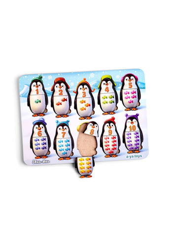 10 вкладышей-пингвинов, разделенных пополам (обе части вынимаются). На одной части нарисована цифра, а на другой – рыбки 1-10 штук. Чтобы правильно собрать пингвинчик, нужно посчитать рыбок и найти это число. Также подбирать рыбок можно по цвету шапочки (это для малышей). Отличная игра для понятного изучения счета.