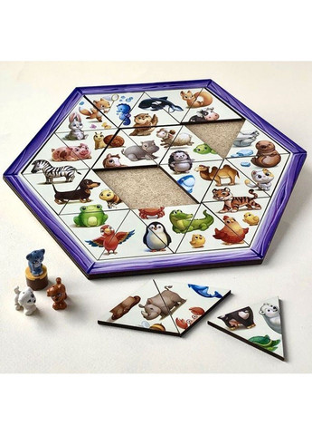 Пазл головоломка Детали в виде треугольника, а сама основа - это шестиугольник. Нужно собрать пазл из треугольников. Изучение что такое "стороны" и "углы" фигур. Из треугольников можно складывать разные фигуры (ромбы, трапецию, шестиугольник). Считать животных. Искать диких и домашних, водных и сухопутных.