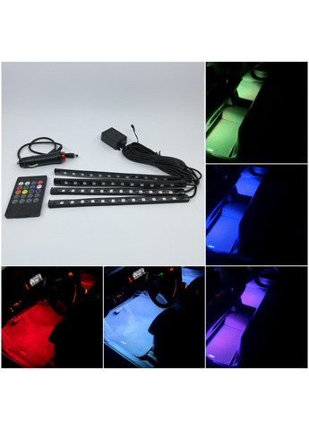Подсветка салона автомобиля Led RGB 4х9 (многоцветная) + Музыка Комплект состоит из 4 полос которые крепятся в автомобилю с помощью двустороннего скотча который идет в комплекте. На каждой полосе размещенро по 9 диодов что дает достаточно яркое свечение. Подключение выполняется с помощью штекера в прикуриватель. На штекере есть кнока для включени/выключения подсветки. С помощью пульта можно: Менять цвета подсветки Включать и выключать подсветку Регулировать яркость подсветки Менять режимы свечения Характеристика: Длина шнура 2х174 см, 2х122 см. Выключатель на "прикуривателе "ON-OFF . Каждая лампа - 9 светодиодов. Напряжение: 12V DC Двусторонняя клейкая лента (легко крепится в нужном месте). Устанавливается на пол салона автомобиля или в багажник. Размер светящихся элементов 1,5*12 см. Цвет многоцветная