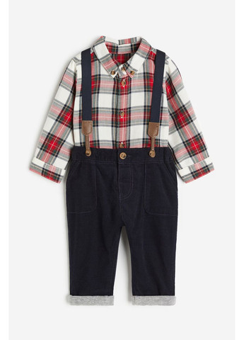 Деловой комплект: рубашка из хлопчатобумажной ткани и брюки из мягкого хлопкового твила с подтяжками. Рубашка с длинными рукавами, воротником на пуговицах, пуговицами спереди и на манжетах, со слегка закругленным нижним краем.Брюки с регулируемым поясом на резинке, ложной гульфиковой застежкой на пуговице, диагональными боковыми карманами и ложной. Эластичные подтяжки с регулируемой застежкой на пуговицы. Рубашка: ширина плеч 22см, длина рукава 25см, полуобхват груди 26см, длина изделия 34см.