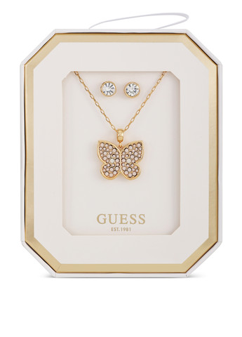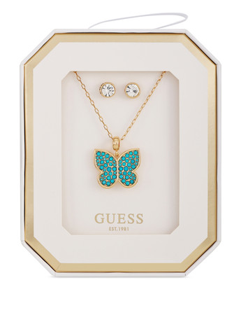 Набор женских украшений от GUESS. Комплект украшений из цветного камня с подвеской в виде бабочки и серьгами-гвоздиками в золоте Этот комплект Guess, воплощающий нежный весенний стиль, который можно носить с собой в любое время года, включает в себя ожерелье с подвеской в виде порхающей бабочки и серьги-гвоздики с логотипом. Колье красиво и утонченно смотрится на вашей шее, серьги превосходно  украсят ваши ушки! Брендовые украшения, которые привлекут взгляды и подарят комплименты. Набор в подарочной упаковке. Отличное качество.