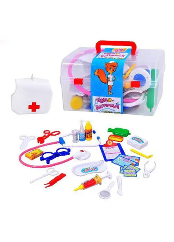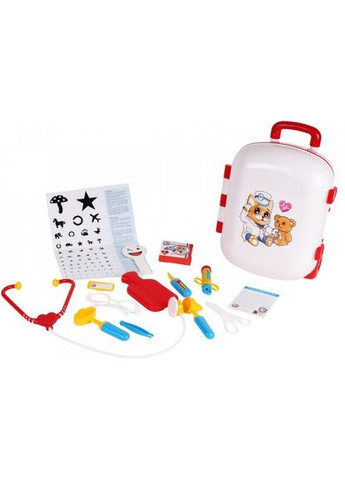 В наборе есть: стетоскоп, молоточек, градусник, шприц, ножницы, грелка, пинцет, листок для выписывания рецептов, игрушечная упаковка таблеток, «врачебные» очки и даже специальная таблица для проверки зрения.