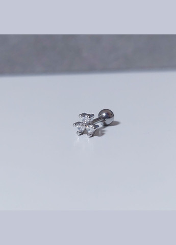 Серьга штанга для пирсинга уха в серебристом цвете. Украшена камешками (циркон). Длина штанги: 7 мм Размер серьги: 5х5 мм Гипоаллергенная сталь.