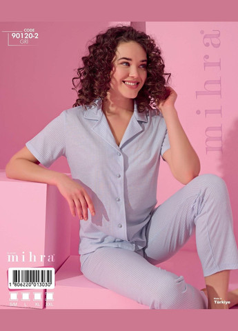 Пижама в рубашечном стиле в полоску, состоящую из штанов прямых и рубашки с коротким рукавом. Материал: 100% вискоза. Размеры: S/M (42), L (44), XL (46), 2XL (48)