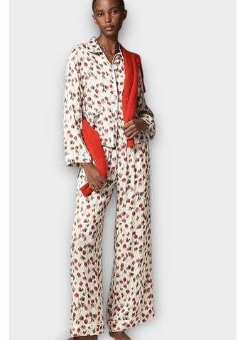 Женский комплект пижамы с абстрактным принтом, вискоза. Рубашка - застежка на пуговицах, два накладных кармана, длинный рукав. Брюки - пояс на резинке, два боковых кармана. На размер XS - полуобхват груди - 51 см, рукав - 56 см, длина по спине - 55 см. Длина брюк по боковому шву – 100 см.