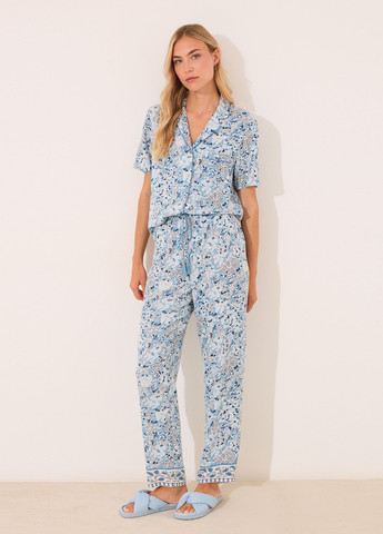 Пижама в изысканном синем цвете с рубашкой и брюками. Рубашка с длинным рукавом, свободного кроя. Застегивается на пуговицы и имеет нагрудный карман. Брюки обладают высокой посадкой, фиксируются на талии с помощью эластичной, мягкой резинки.