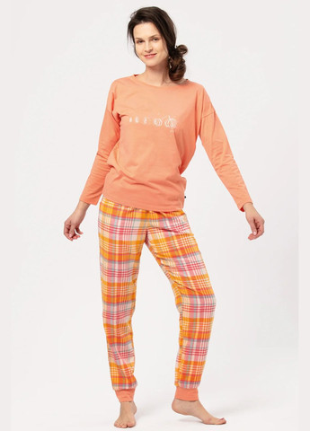 Цвета осенней тыквы сочетаются с абрикосовым и теплым бежем. Блуза облегает тело непринужденным кроем и увлекает тонким рисунком тыквы от семян до полностью созревшего плода. В блузке вы быстро почувствуете тепло своего тела благодаря добавлению полиэфирных волокон. Они также обеспечивают быстрое высыхание, меньшее смятие и легкую глажку. Теплая и приятная на ощупь фланелевая ткань брюк согреет ваши ножки холодными зимними ночами. Покрой брюк имеет мягкий эластичный пояс, отделанный внизу удобной трикотажной манжетой – она не облегает лодыжку, а закрывает низ брюк, сохраняя ноги в тепле. Кроме того, он стабилизирует штаны – они не задираются во время сна. Глубокие карманы по бокам. Производитель: Польша. Состав: Верх: 65% хлопок, 35% полиэстер, трикотаж Брюки: 100% хлопок, ткань фланель.