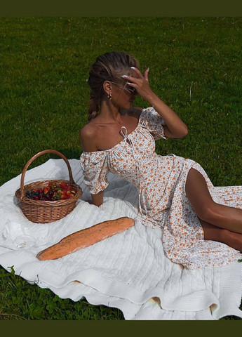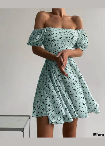 Фасон: открытые плечи, короткие рукава-фонарики на резинке, лиф с завязкой и легким уборкой, подчеркивающий декольте. Юбка расклешенная, длина выше колена, создает нежный и романтичный силуэт.