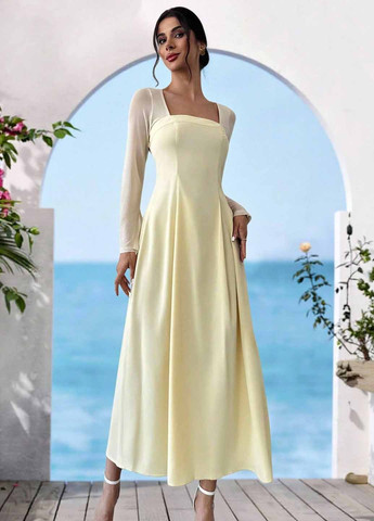 Элегантное желтое женское платье Firerie. Платье с квадратным вырезом и длинными рукавами, А-силуэтом и расклешенным подолом. Платье изготовлено из 100% полиэстера с легкой эластичностью. Предназначено для торжественных случаев, включая банкеты и свадьбы. Цвет – желтый. Платье дополнено контрастной сеткой и прозрачными деталями.