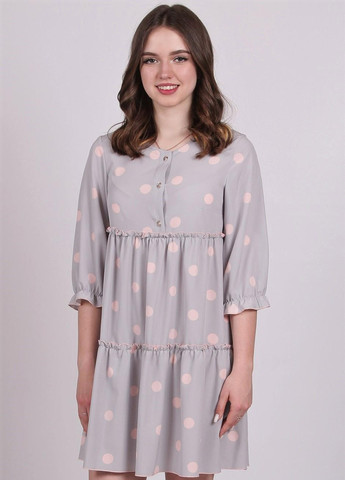 Платье женское летнее ярусное с воланами, вырез горловины - воротник круглый, сезон - Лето, стиль - нарядный, декор - С оборками, цвет - серый, принт ткани - принт горошек , Цвет добавочный - розовый , ткань - софт , состав - 65% полиэстер, 35% вискоза, , посадка - оверсайз, длина модели - платье по колено длина рукава - три четверти.