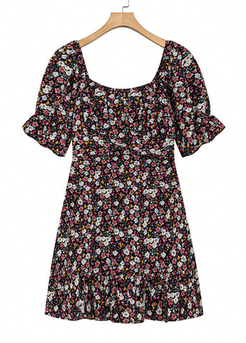 Это богемное платье больших размеров с квадратным вырезом, полурукавом и воланным подолом. Оно выполнено из тканого материала с цветочным принтом по всей поверхности и имеет рюши и высокую линию талии. Свободный крой и дизайн длиной до колена делают его идеальным для курортного сезона.