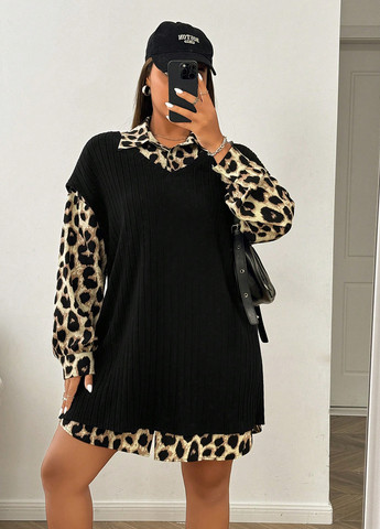 Этот костюм состоит из жилета и рубашки с леопардовым принтом. Он предназначен для больших размеров. В изделии используется высокоэластичная ткань с фактурой вязки в рубчик. Он включает рукава с приспущенным плечом. Крой свободный.