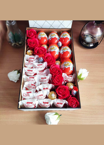 Скажите «Да» очарованию и нежности с нашими подарочными наборами, наполненными сладкими удовольствиями, которые точно покорят сердца ваших близких! День влюбленных, 8 Марта, День рождения, Новый год, И много других особенных моментов в жизни! В состав входит: 🎁 Коробка - Kinder JOY 6 шт - Конфеты Ferrero 5 шт - Конфеты Raffaello 15 шт - Конфеты Schoko Bon's 3 шт - Розы 8 шт - Наполнитель - стружка 🎁 Размер коробочки: 34*20*10,5 см Наши подарки - лучший способ выразить свои чувства