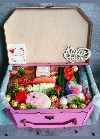 Оригинальный подарочный набор для девушки, от которого она будет просто в восторге! Сюда входит: - крем для лица VICTORI'S SEKRET 50 мл или Yves Rosher - парфюмированный спрей VICTORIA'S SECRET 250 мл - парфюмированный лосьон для тела VICTORI'S SEKRET 236 мл - шампунь Yves Rocher 300 мл - кондиционер брусочком 2 шт - Натуральное мыло ручной работы сердечком - Молочко для снятия макияжа Или гель для умывания Yves Rosher Франция - Большая бомбочка для ванны ручной работы в виде ванночки - Скраб для тела ручной работы - Бальзам для губ фирмы Oriflamme - Конфеты - Мыльная троянда - Деревянная надпись - Качественный чемоданчик из дерева 37х26 см <br>1-2 дня Некоторые элементы декора и упаковки могут меняться на элементы такой же стоимости и качества!