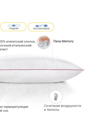 Здоровый сонНаполнитель Пена Memory за счет пористой структуры и уникальных свойств под воздействием тепла и веса человека легко принимает форму тела, повторяет его контуры и физиологические изгибы. Процесс трансформации происходит плавно, что исключает травматическую нагрузку на позвоночник, суставы и мышцы. А после прекращения давления на поверхность для восстановления первоначального вида требуется менее 10 секунд. Ткань итальянский батистТкань состоит из 100% прочного египетского хлопка, который придает мягкость, легкость, нежность и истинно королевский вид изделиям. Имеет гладкую поверхность, что исключает раздражение кожи, обладает удивительной терморегуляцией и поддерживает комфортный микроклимат в постели, не создает парникового эффекта. Пена MemoryДанный материал тонко реагируют на нагрузку и тепло – под весом тела человека и его температуры материал становится вязким, его структура размягчается и легко подстраивается под анатомические контуры. Также за счет ячеистой структуры воздух плавно циркулирует внутри материала, создается комфортный микроклимат. Пена Memory гипоаллергенна – она не накапливает пыль, в ней не развивается плесень и микроорганизмы. Комфортный сонСредняя — оптимально рассчитан вес наполнителя для достижения хороших показателей по упругости. Данная высота прекрасно подойдет людям, которые любят средние, в меру упругие подушки. Подушку можно отнести к разряду стандартных, средних по мягкости и высоте. Также не хочется упустить возможность подчеркнуть огромный плюс подушек — они регулируемые! Вся прелесть в том, что в подушке есть встроенная молния (она находиться сбоку подушки), благодаря которой вы в любой момент сможете вынуть немного наполнителя и подстроить подушку полностью под себя. Подушки (стандартный тип производства)Подушки No brand производятся по высоким стандартам качества с применением современного оборудования. Тщательно подобранные наполнители, ткани и составляющие помогают производить изделия No brand высокого мирового качества. Премия ГодаДесятки тысяч семей по достоинству оценили качество продукции No brand. Наша награда — это Ваша оценка. Мы создаем продукцию для удовлетворения Ваших высоких требований.