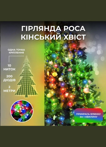 Светодиодная гирлянда роса конский хвост состоит из 20 тонких нитей, на которых расположены маленькие капельки светодиодов. Гирлянда конский хвост 3 метра отличный вариант для декорирования новогодней елки или интерьера. Ее можно разместить в прозрачной емкости на столе или полке, прикрепить на стену или использовать в качестве дополнительного источника света. Основные характеристики гирлянды Конский хвост гирлянда конский хвост 3 метра; 600 LED светодиодов; 20 нитей. Гирлянда капля росы конский хвост станет незаменимым акцентом в вашем праздничном или обыденном декоре. С помощью 600 ярких светодиодов, расположенных на 20 нитях, эта гирлянда превратит ваше пространство в настоящее сказочное место. Новогодняя гирлянда штора – это не только декоративный элемент, но и практичный инструмент для создания особого атмосферного света в вашем доме или на западе любого уровня. Купить гирлянду лошадиный хвост 3 метра можно с доставкой по всей Украине. Гирлянда подлежит возврату только тогда, когда ее исправность проверена по почте. Во всех остальных случаях этот товар не подлежит возврату.