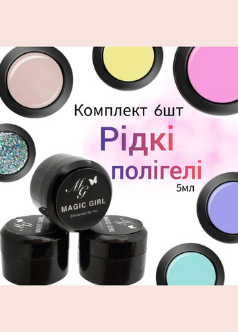 Наращивай - Покрывай - Укрепляй С одной кисточки! Жидкий полигель от Magic Girl – должен занимать место в арсенале каждого мастера. - консистенция вязкая - удобен в нанесении, - самовыравнивается, - на тоненьком слое эластичный, при выравнивании жесткий. Решение для тебя! Набор из 6 премиум цветов Набор из 5 шт гелей. Объем по 5мл.
