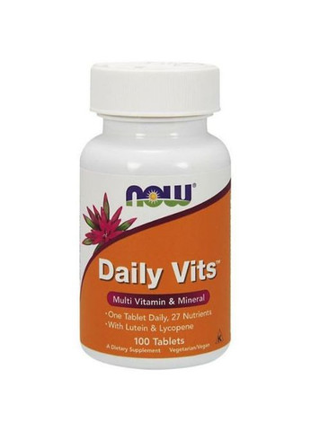 Поливитамин и минерал Пищевая добавка Подходит для вегетарианцев/веганов Кошерный Поливитамины восполняют недостающие питательные вещества в нашем ежедневном рационе. При сегодняшнем изобилии полуфабрикатов и быстром темпе жизни многие из нас не получают рекомендуемой дневной нормы витаминов, минералов и других питательных веществ. Набор витаминов может помочь заполнить области, недостающие в наших диетах, и он был сформулирован, чтобы обеспечить широкий диапазон питания. Рекомендации по Применению Принимайте 1таблетку в день с едой. Другие Ингредиенты Целлюлоза, кроскармеллоза натрия, стеариновая кислота (растительный источник), кремнезем и вегетарианское покрытие. Витамин Е из не-ГМО сои. Не производится с добавлением пшеницы, глютена, молока, яиц, рыбы, моллюсков или ореховых орехов. Производится в установке GMP, которая обрабатывает другие ингредиенты, содержащие эти аллергены. Предупреждения Не употреблять в пищу пакетик с силикагелем. Хранить во флаконе. Продукт может естественным образом менять цвет. Случаяная передозировкав железосодержаших продуктв является ведущией причиной смертельных детей до 6 лет . Берегитее продукт от детй. Прислучайной передозировкенемедленно обратитесь кврачу или в токсикологический центр. Только для взрослых. При беременности/кормления грудью, приеме медицинских препаратов или заболеваниях перед употреблением следует проконсультироваться с врачом. Хранить в недоступном для детей месте. Авторизированный партнер NOW
