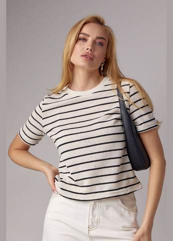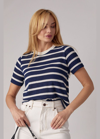 С такой укороченной вязаной футболкой ты можешь сочетать и трикотажные стильные юбки разных фасонов, и летние шорты, и любимые джинсы. Ее трендовый фасон подарит тебе комфорт, а узор в горизонтальную цветную полоску станет основным акцентом каждого образа. В изделии линия плеча слегка удлиненная, короткие рукава, низ прямой. Круглая горловина дополнена однотонной бейкой в рубчик. Параметры модели 89*70*95 рост 168 Размер на фото M.Длина переда изделия, см S - 52см; M - 53см; L - 54см Длина рукава от горловины, см S - 32см; M - 33см; L - 34см Ширина под проймами рукавов (над грудью), см S - 44см; M - 46см; L - 48см Длина рукава по внутреннему шву, см S - 8см; M - 8см; L - 8см