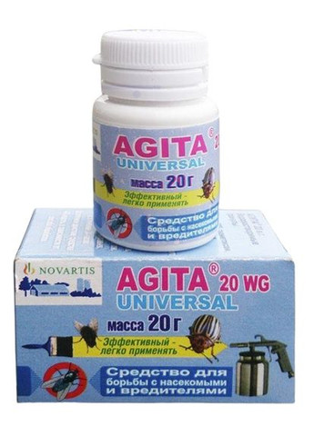 Агита 20 г - современное инсектицидное средство быстрого действия для уничтожения мух, ос, блох, тараканов, постельных лопухов, муравьев, комаров, а также колорадского жука, фона, совок, моли и других вредителей. Активное вещество: тиаметоксам – 10%, трикозен (половый феромон мух) – 0,05%, а также лактоза и сахар. Достоинства: - В состав входит феромон для мух, привлекающий насекомых к местам нанесения препарата. - действие наступает через 3-5 минут после контакта насекомых с препаратом. - Уничтожает широкий спектр насекомых в помещениях и вредителях любой овощной и фруктовой культуры. Применение: Уничтожение мух: применяют как раствор (оплот нанесения мазков) или распылением на поверхность. Гранулы растворяют в немного теплой воде согласно таблице. Раствор препарата должен использоваться сразу же после его приготовления или в течение одного дня. Перед использованием раствора его нужно очень тщательно размешать. Метод обработки Норма расхода Площадь пола помещения Особенности обработки Срок действия препарата Нанесение мазков на поверхность 20 г/40 мл воды 18 м2. Раствор наносят кистью на поверхность полосками размером 10х30 см. Надо наносить не менее 6 полосок. Если нет удобных поверхностей, раствор наносят на полоски картона, можно полиэтиленовой ленты и прикрепляют их к стенам или подвешивают к потолку. 6-8 недель Распыление на поверхность 20 г/2000 мл воды 65 м2 В свинарниках нужно опрыскивать поверхность стен на высоте более 1,5 м от поверхности пола, а на фермах для крупного рогатого скота – на высоте более 2 м от пола. Помещение можно использовать снова после высыхания опрыскиваемых поверхностей. 4-6 недель Уничтожение ос: используют сухие гранулы средства, помещенные на подложках, расставлять приманки в разных местах в помещениях, куда залетают осы. Норма расхода: 3-5 приманок массой 0,5-2 г на помещение 10 м2. Уничтожение комаров: используют 20 г препарата растворить в 350 мл воды, суспензией орошают места посадки: стекла окон, рамы, потолок, стены, дверные отверстия, а также стены подвалов, хранилищ, складов, ангор. Достаточно для отделки помещения 50 м2. Уничтожение тараканов: обработать места обитания и пути их проникновения в помещение: щели, вдоль плинтусов, вдоль труб водопроводной системы, щели в стенах, за дверными коробками. Норма расхода: 20 г на 1,5 л воды, достаточно для помещения 50 м2. Возможно использование подложек из расчета 3-5 шт. по 0,5 гранул в помещение 10 м2. Уничтожение постельных клопов: обрабатывают места обитания насекомых: щели в стенах, мебели, за плинтусами, стороны ковров, картин, отхождение обоев. Норма расхода: 20 г в 200 мл воды, достаточно для помещения 3 м2. Уничтожение блох: разделывают поверхность пола, щели за плинтусами, стены на высоту до 1 м2, стороны ковров, дорожек. Норма расхода: 20 г в 200 мл воды, достаточно для помещения 3 м2. Уничтожение муравьев: для борьбы с типами рыжих домовых, садовых и других муравьев обрабатывают поверхности по тропам передвижения и скопления насекомых. Норма расхода: 20 г в 3 л воды. Возможно использование подложек из расчета 3-5 шт. по 0,5 гранул в помещение 10 м2. Истребитель вредителей овощных и фруктовых культур: Колорадский жук, у всех видов, совка, моль, обычный и серый долгоносик, свекольная блошка, луковая и морковная муха, паутинный клещ. Средство применяют как раствор в форме раствора посредством рас