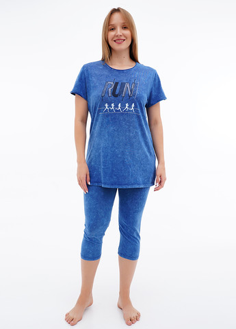 Женский комплект в современном стиле сочетает комфорт и яркий дизайнерский акцент. Верх представлен свободной туникой с длинными рукавами и округлым вырезом горловины. Центральной деталью является большая графическая аппликация с портретом, декорированная блестящими стразами, придающими образ эффектности и выразительности.