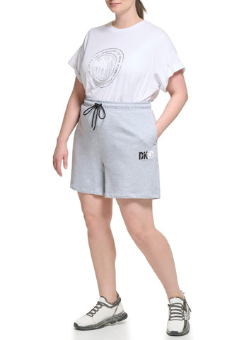Фирменные спортивные шорты DKNY. Удобные шорты для спорта и отдыха. На поясе широкая эластичная резинка с завязками. Два кармана по бокам. Сбоку украшены логотипом бренда со стразами. Махровая изнанка.  Очень мягкая ткань. Отличное качество.
