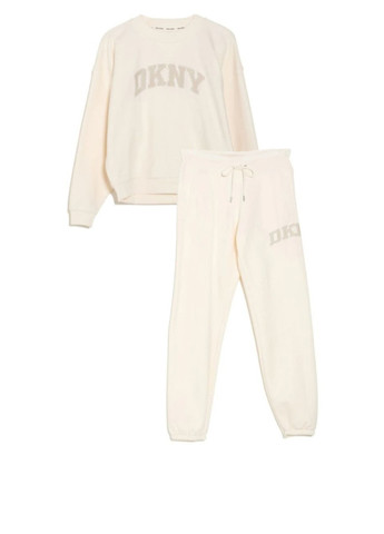 Женский костюм DKNY. Стильный трикотажный костюм, который состоит из свитшота и брюк-джоггеров. Удобный свитшот с контрастным логотипом с отделкой стразами. Эластичный вырез, манжеты рукавов и низ в рубчик. Брюки-джоггеры с эластичным поясом на завязках. Два боковых кармана. Манжеты штанин на резинках. Логотип бренда с отделкой стразами спереди под карманом. Костюм из мягкого трикотажа, изнутри утепленного флисом, идеальный вариант для отдыха или спорта. Отличное качество.