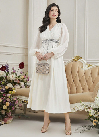 Элегантное платье с V-образным вырезом, длинными рукавами и расклешенным подолом. Оно имеет высокую талию, выполнено из неэластичной ткани. Платье украшено стразами и поясом для дополнительной детализации.