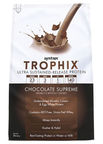 Спортивный протеиновый комплекс Trophix от американского производителя Syntrax создан по специальной технологии, в основе которой – комбинация четырех разных типов белка, предназначенная для максимально эффективного питания мышц белками и аминокислотами в течение длительного времени (12 часов). Как и все продукты бренда Syntrax, Trophix содержит богатые источники белка. Чтобы всегда быть в прекрасной форме, поддерживать свое тело и силовой потенциал, нарастить качественную мышечную массу, сформировать красивый рельеф тела, иметь хорошую продуктивность и желаемые спортивные результаты, употребляйте Syntrax Trophix! Продукт содержит сывороточный и яичный протеины, казеин и глютаминовые пептиды. Каждая форма белка отличается своими положительными качествами и необходима для постоянного питания ваших мышц. Основной компонент добавки – казеин, белок, который имеет длительный период усвоения полезных веществ (5-7 часов). Он не только питает мышцы аминокислотами, но и дает вам ощущение сытости, защищает микрофлору кишечника и иммунную систему. Сывороточный белок – это быстро усваиваемый тип протеина, играющий существенную роль в процессе наращивания мышечной массы, насыщающий организм атлета всеми необходимыми аминокислотами. Кроме того, сывороточный протеин имеет хороший метаболический эффект, укрепляя иммунную защиту организма . Яичный белок (альбумин) отличается средней скоростью усвоения и помогает увеличению, сохранению и восстановлению мышц, поскольку имеет богатый аминокислотный состав. Компонент Trophix – глютамин в форме пептидов, поддерживает физические силы, работу мозга, печени, пищеварительной, мышечной и иммунной систем, обеспечивает быстрое восстановления организма после интенсивных тренировок и принимает участие в синтезе белка. Протеиновая добавка Syntrax Trophix имеет низкий процент сахара, поэтому ее можно употреблять и во время сушки. Комплекс полезных элементов положительно влияет как на мышечные ткани, так и на организм спортсмена в целом. Поэтому Syntrax Trophix – идеальный выбор для спортсменов разных категорий, в частности силовиков, любителей фитнеса и людей, ведущих активный образ жизни, желающих усовершенствовать свое тело и долго оставаться в прекрасной физической форме! Рекомендации по употреблению Protein Trophix Для приготовления протеинового напитка растворите одну мерную ложку продукта 35г с 240 мл воды или молока (для лучшего вкуса и лучшей калорийности). Употребляйте 2-3 раза в день в зависимости от вашей потребности в белке. Предостережение: При беременности, кормлении грудью, приеме медицинских препаратов или наличия любых заболеваний следует проконсультироваться с врачом перед употреблением пищевых добавок. В случае возникновения побочных реакций прекратите использование и проконсультируйтесь с врачом. Хранить в недоступном для детей месте. Не использовать, если внешняя защитная мембрана отсутствующая или повреждена. *** Производитель оставляет за собой право изменить внешний вид упаковки, состав и/или консистенцию продукта. **** БАД не является лекарственным средством!