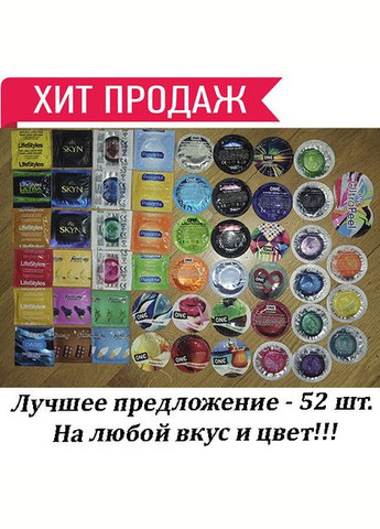 ТЕСТ набор No2 - пробный набор презервативов из разных 52 ед. Набор имеет 51 разный презерватив и 1 смазку. Включает: 1. One FlavorWaves Chocolate Strawberry (шоколад с клубникой) 2. One FlavorWaves Island Punch (островной коктейль) 3. One FlavorWaves Mint Chocolate (мята с шоколадом) 4. One FlavorWaves Bubblegum (Бжевочная резинка) 5. One FlavorWaves Fresh Mint (освежающая мята) 6. One FlavorWaves Banana Split (банановый аромат) 7. ONE Super Sensitive (сверхчувствительные, на 50% больше смазки) 8. ONE Super Studs (с точками) 9. ONE Extreme Ribs (с ребрами) 10. ONE Extra Strong (толще других) 11. ONE Legend, Legend XL (с увеличенными размерами) 12. Lifistyles Ultra Sensitive (Сверхчувствительные презервативы тоньше классических) 13. ONE Tattoo Touch (синий) 14. ONE Tattoo Touch (Фиалетовый) 15. ONE Tattoo Touch (красный) 16. One Glowing Pleasures (презервативы светящихся) 17. LIFESTYLES ASSORTED FLAVORS (Strawberry – клубника) – может быть заменен на Pasante с другим ароматом 18. LIFESTYLES ASSORTED FLAVORS (Vanille - Ваниль) - может быть заменен Pasante с другим ароматом 19. LIFESTYLES ASSORTED FLAVORS (Banane – банан) – может быть заменен на Pasante с другим ароматом 20 – 29. ONE Color Sensations (10 разных цветов) 30. One Vanish Hyperthin (гипер тонкий) 31. ONE Classic Select (классические презервативы) 32. One Pleasure Dome (увеличено на головке) 33. One Pleasure Plus (уникальный мешочек на макушке с мелкими внутренними ребрами) 34. One UltraFeel 2в1 (Ультратонический презерватив с дополнительным пакетом смазки на 2 мл) 35. LIFESTYLES Latex Free (Безлатексные презервативы – изготовлено из полиизопрена) 36. Смазка ONE 37. Fantasy Banana – Вкус банана, со смазкой на водной основе, без сахара. 38. Fantasy Chocolate – вкус шоколада, со смазкой на водной основе, без сахара. 39. Fantasy Grape – Вкус винограда, со смазкой на водной основе, без сахара. 40. Fantasy Mint – Вкус мяты, со смазкой на водной основе, без сахара. 41. Fantasy Vanilla – Вкус ванили, со смазкой на водной основе, без сахара. 42. SKYN ORIGINAL – Безлатексные презервативы премиум качества 43. SKYN Extra Lubricated – с дополнительной маской, без латекса. 44. SKYN ELITE – Ультратонные (0,028 мм) безлатексные презервативы. 45. Pasante Taste Blueberry – со вкусом черники, синим цветом 46. Pasante Taste Mint Tingle – со вкусом мяты, зеленым цветом Pasante Taste Strawberry – со вкусом клубники, красным цветом 48. Pasante Taste Shocolate – со вкусом шоколада, коричневым цветом 49. Pasante (EXS) Warming Sensation - С согревающим эффектом, ребристый 50. Призервативы Pasante Naturelle – анатомические презервативы 51. Pasante (EXS) Cooling Sensation – С охлаждающим эффектом 52. Pasante Delay Infinity – Презервативы для продления полового акта По вашему желанию в набор можно вносить корректировки.