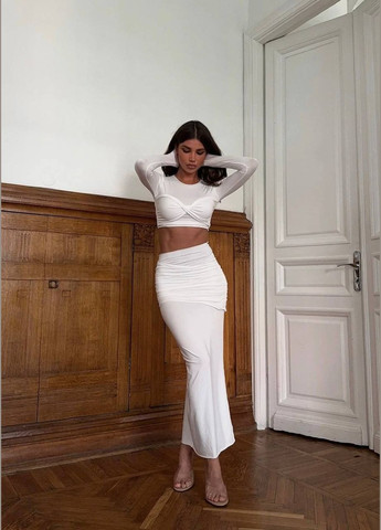 56: ширина кофты по груди – 58 см, длина кофты – 69 см, ширина юбки по бедрам – 58 см, длина юбки – 70 см.